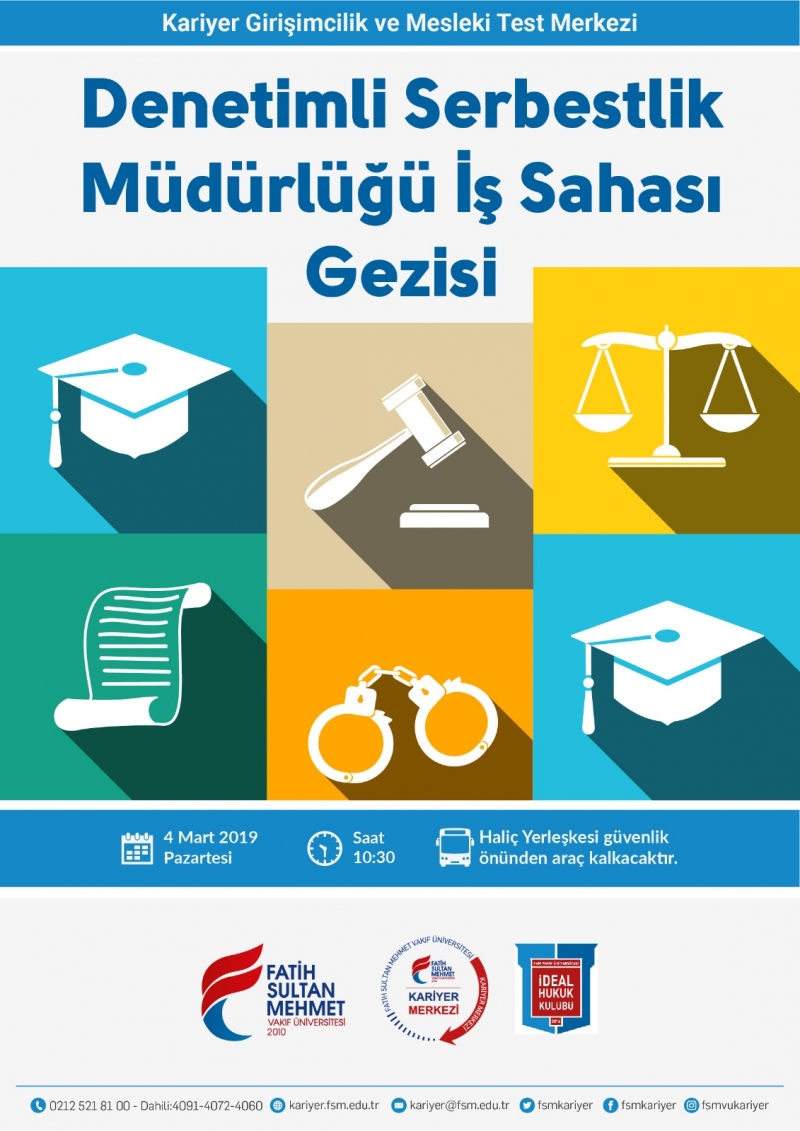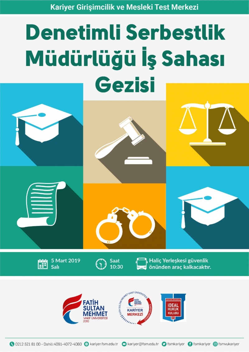 Kariyer Merkezi ve İdeal Hukuk Kulübü iş birliğiyle 4 ve 5 Mart’ta Denetimli Serbestlik Müdürlüğüne iş sahası gezisi düzenlenecektir. İki günde Saat 10.30’da Haliç Yerleşkesi’nden servis hareket edecektir.