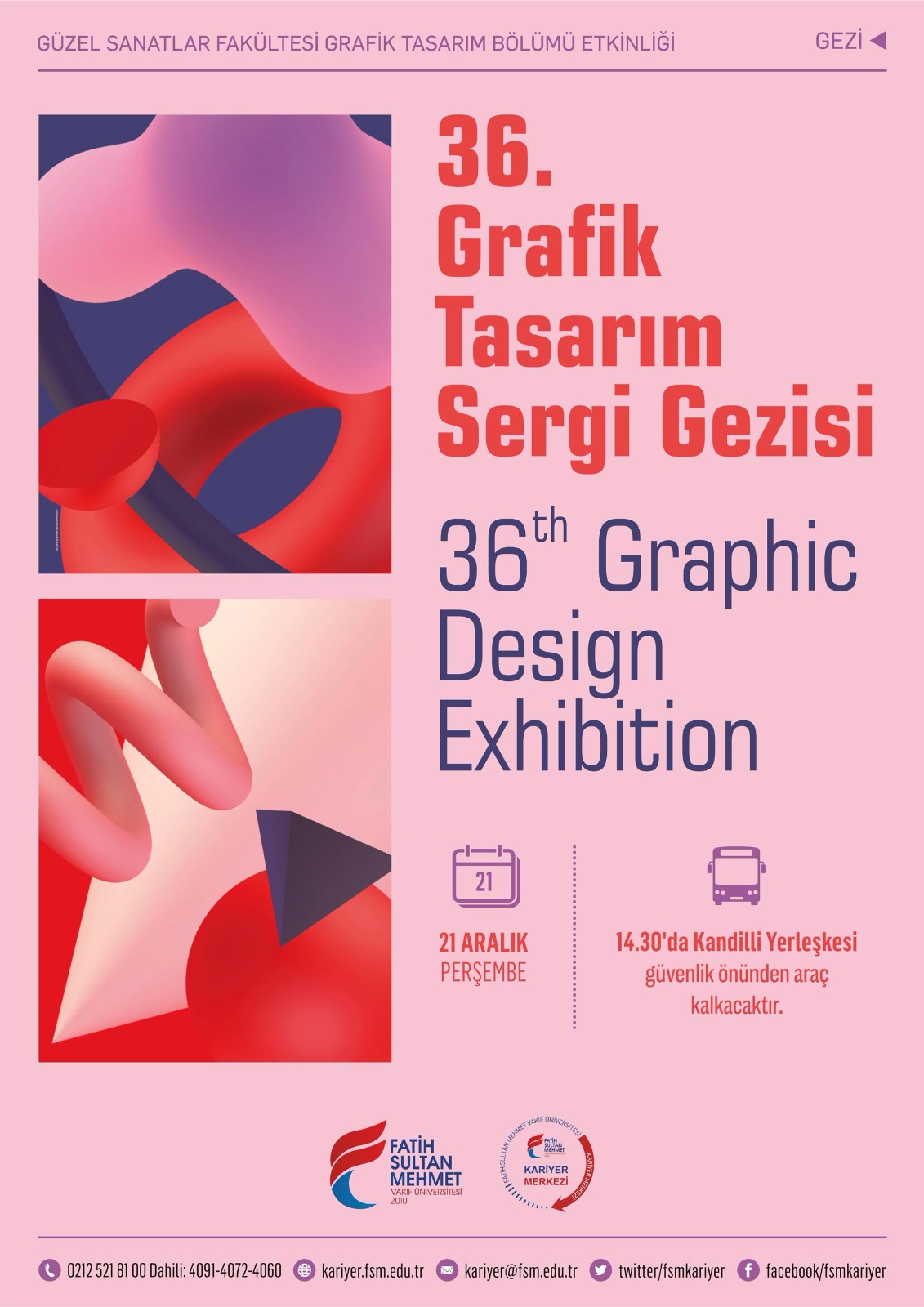 Güzel Sanatlar Fakültesi Grafik Tasarım Bölümü işbirliğiyle 21 Aralık 2017 Perşembe günü 36. Grafik Tasarım Sergi Gezisi düzenlenecektir. Kandilli Yerleşkesi güvenlik önünden saat 14.30'da servis hareket edecektir.