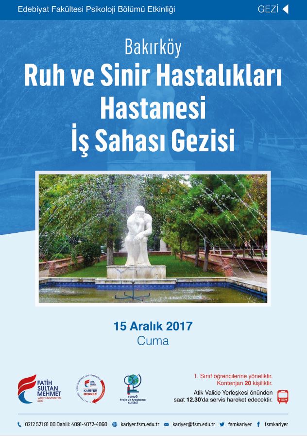 Edebiyat Fakültesi Psikoloji Bölümü tarafından 15 Aralık 2017 Cuma günü Bakırköy Ruh ve Sinir Hastalıkları Hastanesi İş Sahası Gezisi düzenlenecektir. Üsküdar Yerleşkesi önünden 12.30'da servis hareket edecektir. Kontenjan 20 kişiliktir.