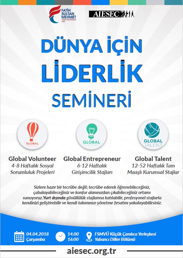 Fatih Sultan Mehmet Vakıf Üniversitesi Yabancı Diller Bölümü ve AIESEC ortaklığında Dünya için Liderlik Semineri düzenlenecek. Üniversite öğrencileri ve mezunlar için sosyal sorumluluk ve profesyonel staj imkânları sunan, şirketler ve sivil toplum kuruluşlarını farklı ülkelerdeki genç yeteneklerle buluşturan gençlik organizasyonu AIESEC, seminerde öğrencilere yönelik projelerini anlatacak.