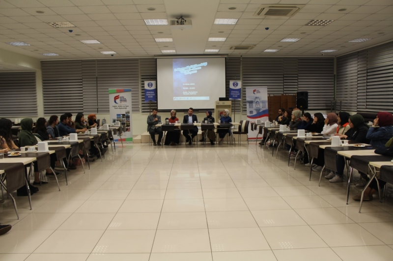 Biyomedikal Mühendisliği Bölümü Arş. Gör. ve aynı zamanda mezunumuz olan Reyhan Gürleyen moderatörlüğünde başlayan toplantıda konuşmasına devam eden Gürleyen, “FSMVÜ’nin desteğini çok gördüm. Hocalarımız alanında uzman oldukları için gerek iş hayatına gerekse akademik hayata iyi hazırlıyorlar.” diyerek sözü bir diğer mezunumuz olan Fatma Elif Tuncer’e bıraktı. Tuncer, bu bölüme nasıl karar verdiğinden ve üniversiteyi nasıl tercih ettiğinden bahsederek, “ İleride bana fazla fırsat getireceğini düşündüğüm için bu bölümü seçtim. Araştırma kadrosunun yetkinliği ben cezbetti. Okulun kalitesini staj esnasında fark edebiliyorsunuz. Yabancı dilinizi geliştirmek bu alanda size fayda sağlayacaktır.” dedi.