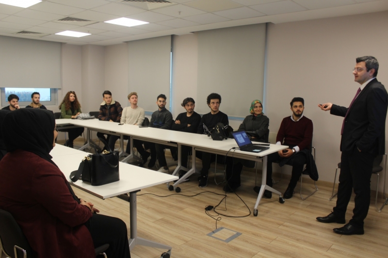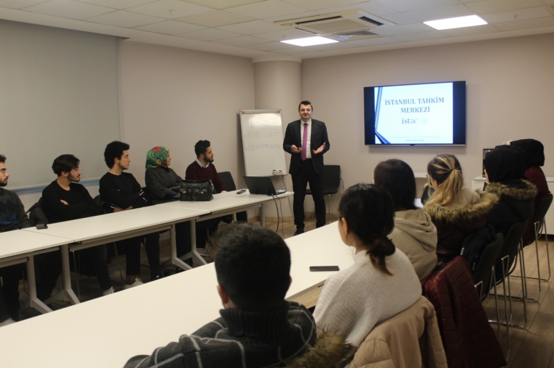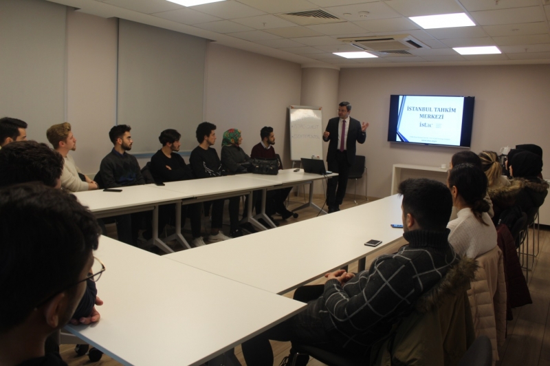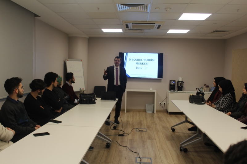 Kariyer Merkezi Eğitim Koordinatörü Seda TÜRKYILMAZ ve Hukuk Fakültesi Araştırma Görevlisi Esra GÜLTEKİN eşliğinde düzenlenen gezimizde İstanbul Tahkim Merkezi Genel Sekreteri Av. Yasin EKMEN konuşmasına İSTAC’ın tanımından bahsederek başladı. Ofis ortamlarını ve kullanım alanlarını anlatan Ekmen, TOBB ve Barolar Birliğinin en büyük destekçileri olduğundan bahsetti. Hazırlanan büyük projelerde artık İSTAC şartı kullanılmaya başladığını belirterek hangi projelerde kullanıldığına dair bilgiler verildi. Tahkim nedir sorusuna cevap veren Eken, seri ve normal tahkim hakkında hazırlamış olduğu sunumdan örnekler vererek anlattı. Uyuşmazlığın olduğu yerde tahkimin bulunduğunu ifade eden Ekmen, bankaların seri tahkimle daha çabuk çözüme kavuştuğundan bahsetti. Sadece tahkim değil arabuluculuk, seri tahkim, acil durum hakemi ve kurallarını verdiği örneklerle anlatıp “Kariyer planlamanızı bu doğrultuda yapabilirsiniz. 5 yıl sonra bu durum daha farklı gelişebilir.” diyerek öğrencilerimize tavsiyelerde bulundu.