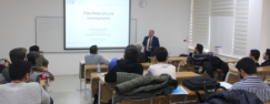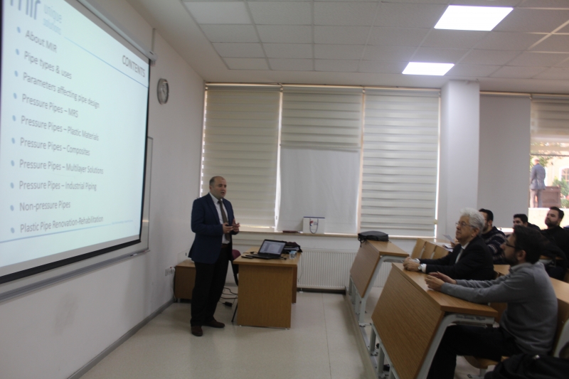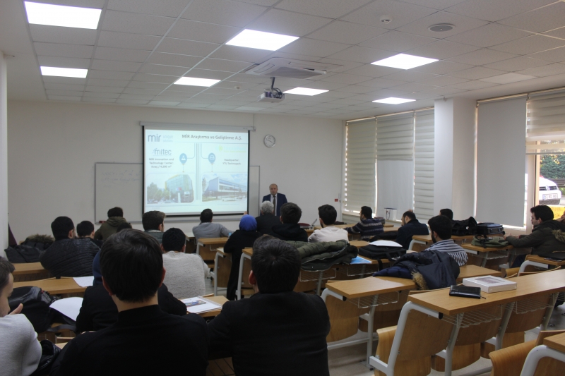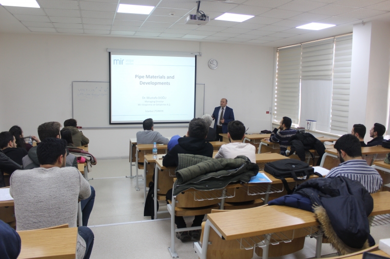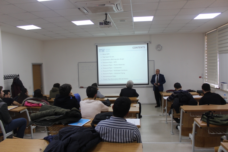 Dr. Mustafa DOĞU, plastik boru ve bağlantı elemanları sektöründe AR-GE’ye verdiği önemle öne çıkan Dizayn Grup’un AR-GE Bölümü olarak 90’lardan bu yana çalışmalarını sürdüren Mir AR-GE’nin, 2007 yılında teknoloji, ürün ve yöntem geliştiren; bunlar için gerekli olan her türlü altyapıya sahip olan bir AR-GE şirketi olarak kurulduğunu öğrencilerimize anlattı.