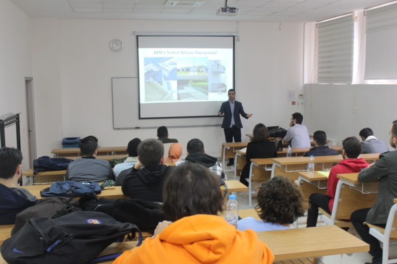 “Mühendis olduğunuzda zamandan kazanmanız gerektiğini anlayacaksınız.” diyen Yeşilyurt, gelişmiş ülkelerin projelerini BIM üzerinden gerçekleştirdiklerini ve Türkiye’de yavaş yavaş yaygınlaştırıldığından bahsederek dünyada ve Türkiye’de BIM kullanımlarını verdiği örneklerle öğrencilerimize anlattı.